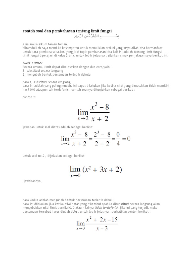 Jawaban Soal Limit. Sebelumnya kita sudah belajar pengertian, generic structure dan contoh teks announcement. Pada kesempatan kali ini, saya akan memberikan beberapa contoh soal tentang limit dan kekontinuan plus dengan jawabannya.